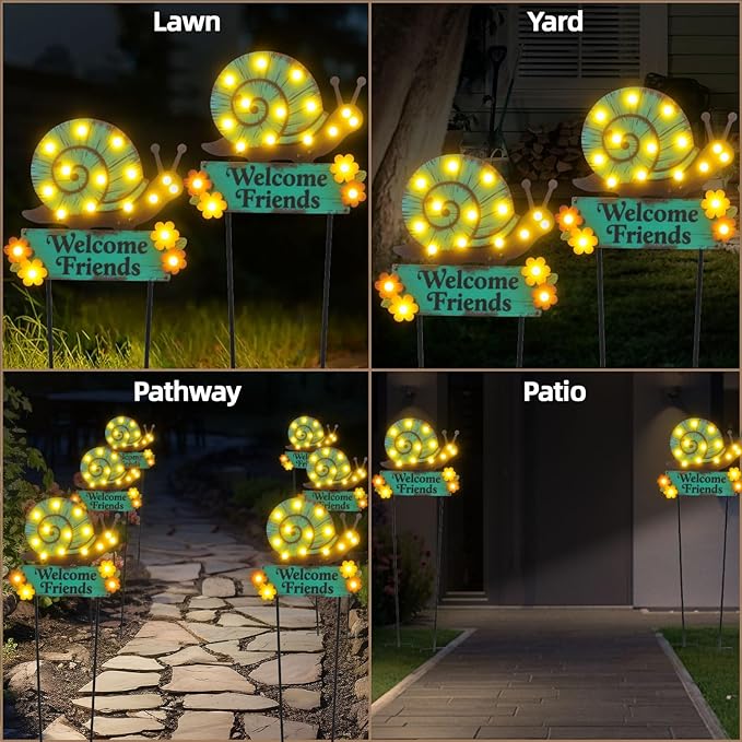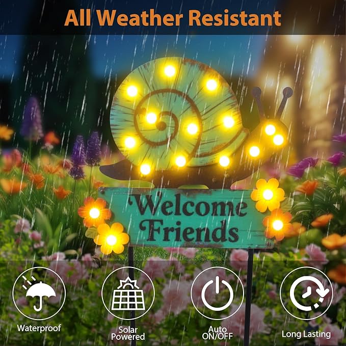 Whimsical 43.3inch Snail Solar String Lights: These decorative solar garden stakes feature brightly colored iron snails with charming flower accents and a "Welcome Friends" sign and shining with 18 bulbs solar patio lights, creating a warm and inviting atmosphere in your garden or yard.