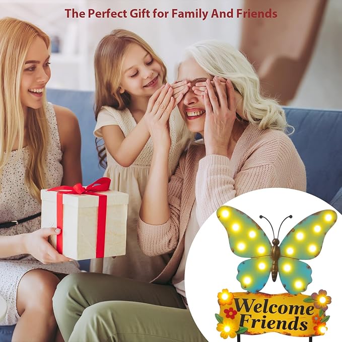 Charming 45inch Solar Garden Lights: These butterfly garden decor features colorful iron butterflies with a "Welcome Friends" patio sign and shining with 18 bulbs solar lights, adding warmth and charm to your outdoor spaces like gardens, yards, pathway, or patios.