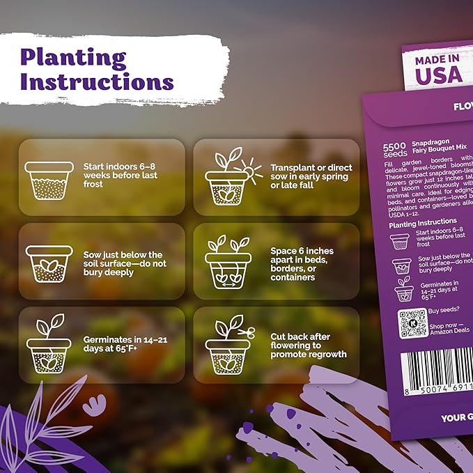 Easy Start: Sow dwarf snapdragon seeds indoors 6-8 weeks before last frost, then transplant 6" apart, or plant directly early spring or late fall; seeds for planting flowers mature quickly for early blooms in containers & borders gardens.