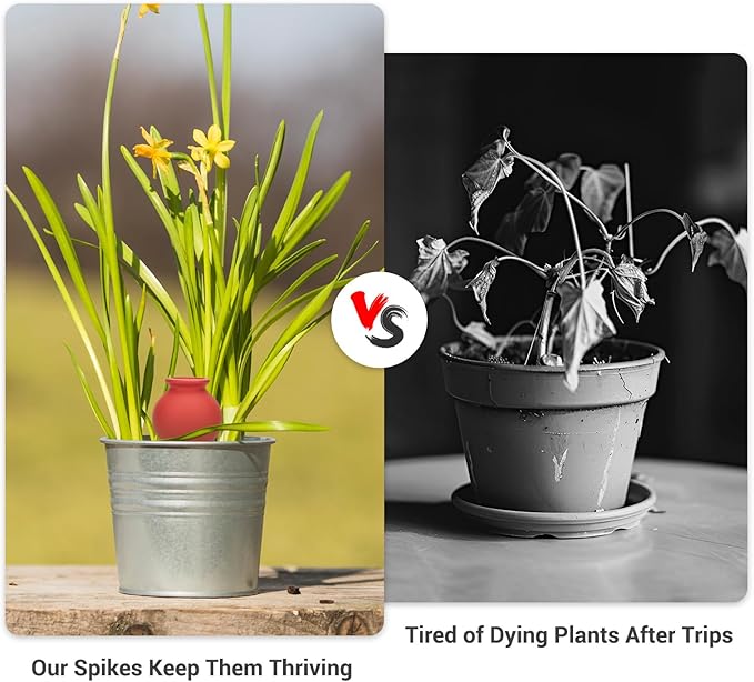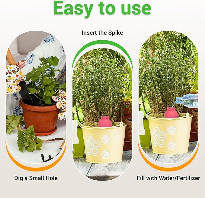 Simple Two-Step Setup: Just fill the spike with water or nutrient solution and insert it into the soil. The streamlined design prevents clogging and works equally well as self watering globes for outdoor plants or watering bulbs for outdoor plants in larger containers