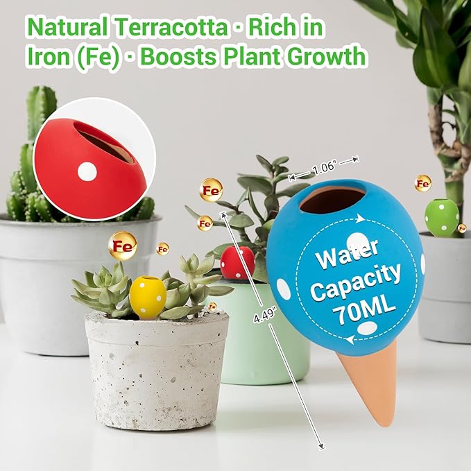 Natural Terra Cotta Watering Spikes: Crafted from porous, unglazed terracotta rich in iron (Fe), these plant watering spikes provide essential nutrients while ensuring gradual moisture release. The eco-friendly material automatically degrades over time, making it a sustainable choice for conscious gardeners