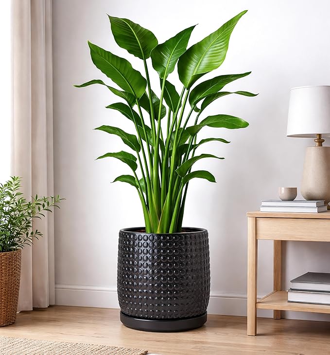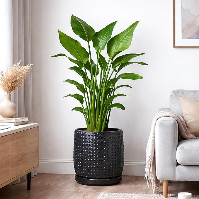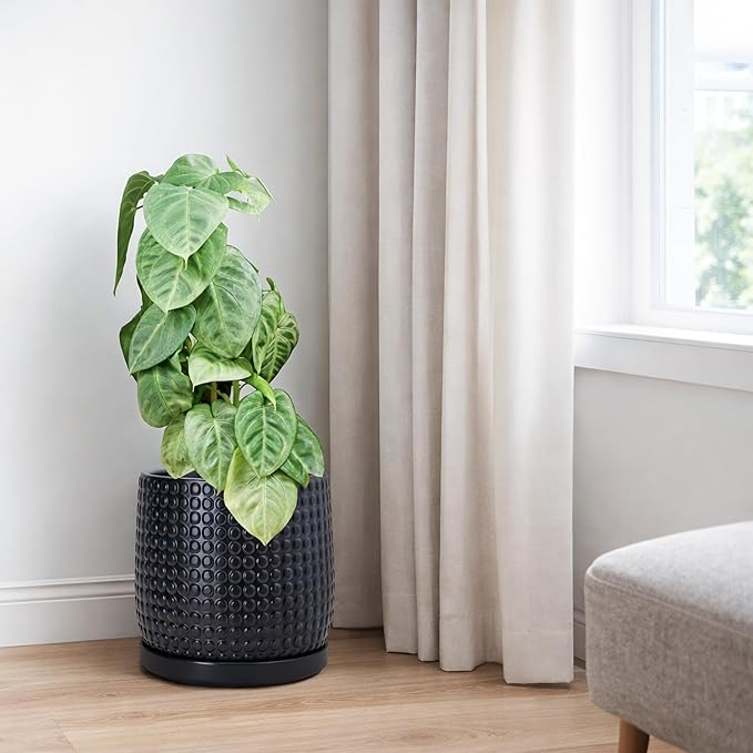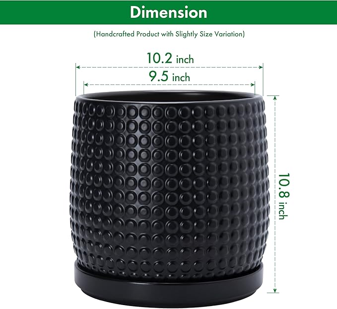 D'vine Dev 10 Inch Ceramic Beaded Stoneware Planter Pot - Flower Pot with Drainage Holes and Saucers for Indoor Succulent Plants or Flowers, Ebony Matte, 27-C-P-6