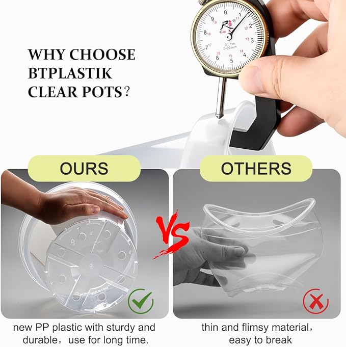 Sturdy and Reusable: Clear pots for plants are made of new pp plastic, which makes them no smell and resistant to high temperatures. Transparent seedling pots has the characteristics of stable mechanism, strong and durable, no deformation, very light and so on. Plant growing pots can cultivate strong and healthy tomatoes, strawberry, mints, carrots, potato, herbs and violet more.