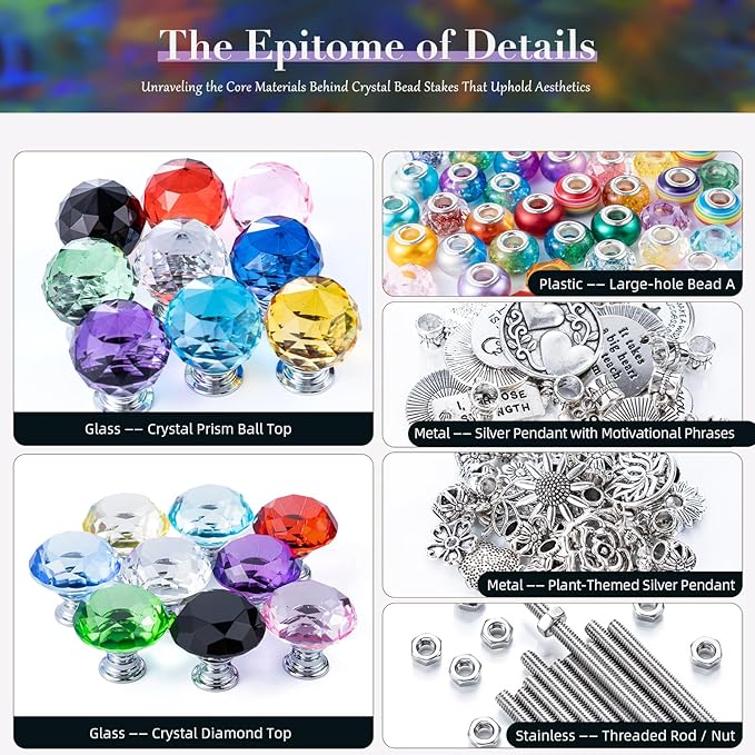 RICH SET, BEAUTIFUL EMBELLISHMENTS: This colorful garden stakes set includes eighteen sets of materials, along with a designer gift box and cards, meeting various needs such as gifting, team activities, and party crafts. You will receive a total of 513 items, including 18 crystal top beads, 18 12-inch threaded rods, 396 beads, 43 plant pendants, 18 inspirational pendants, and 20 nuts.