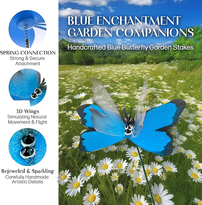 Handmade Blue Sky Butterfly Garden Stakes - Set of 7 Premium 3D Hand-Painted Butterflies with Fluttering Spring Movement, Weatherproof Metal Rod, Outdoor Indoor Decor, Ideal Gift