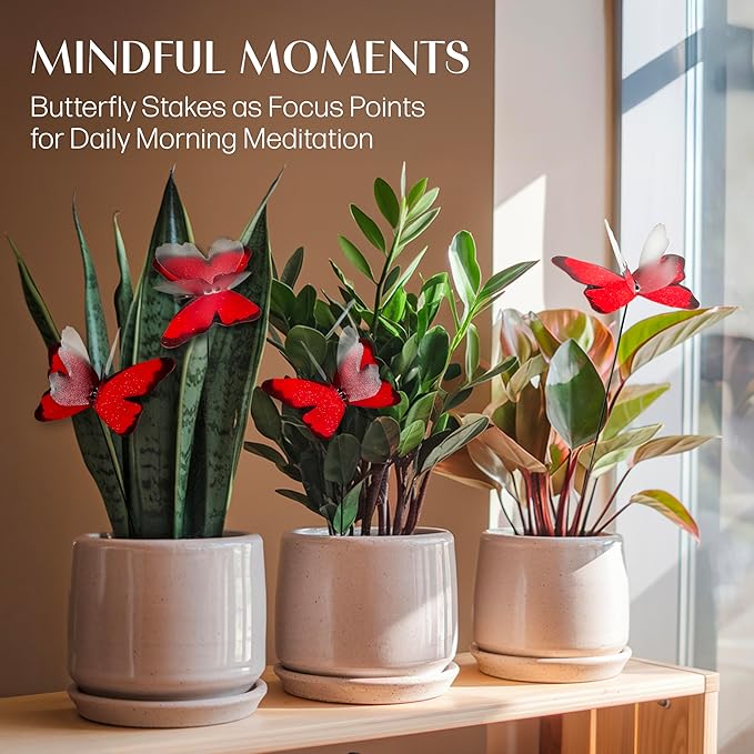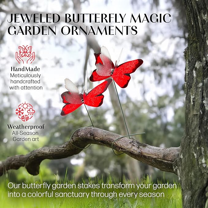 Handmade Red Butterfly Garden Stakes - Set of 7 Premium 3D Hand-Painted Butterflies with Fluttering Spring Movement, Weatherproof Metal Rod, Outdoor Indoor Decor, Ideal Gift