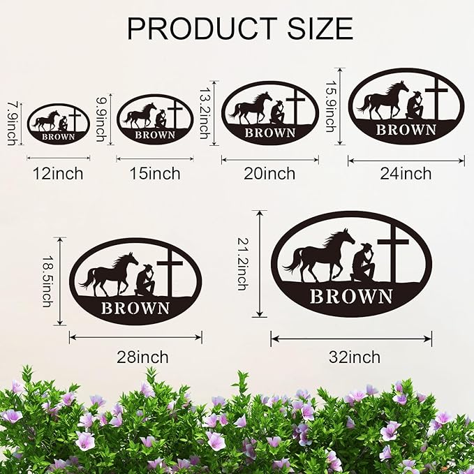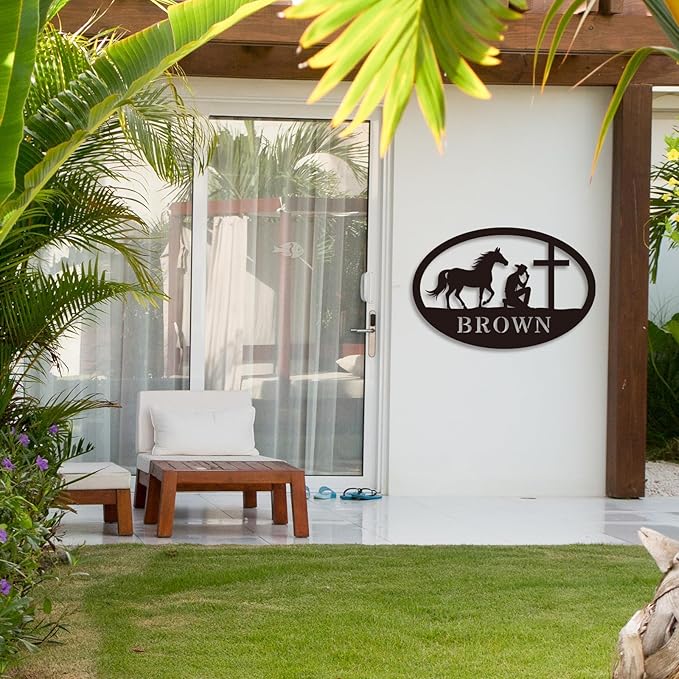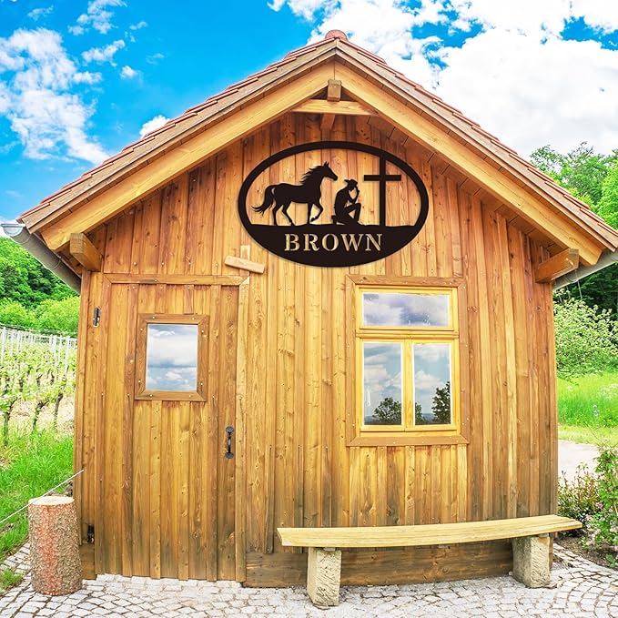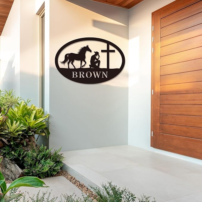 Western Faith Wall Art: Personalized metal sign features a cowboy or cowgirl kneeling with a horse at a cross, blending Christian faith and Western lifestyle—perfect for adding spiritual warmth to ranches, farms, or rustic home décor.