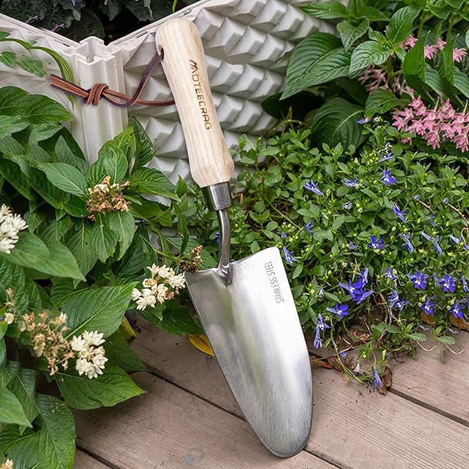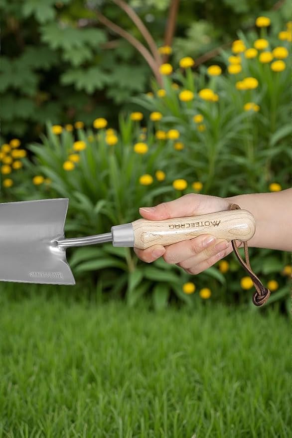 This trowel garden tool comes with 3000-times sanded wooden handle which fits naturally in your hand, reducing wrist strain—comfortable to use for hours, even without gloves