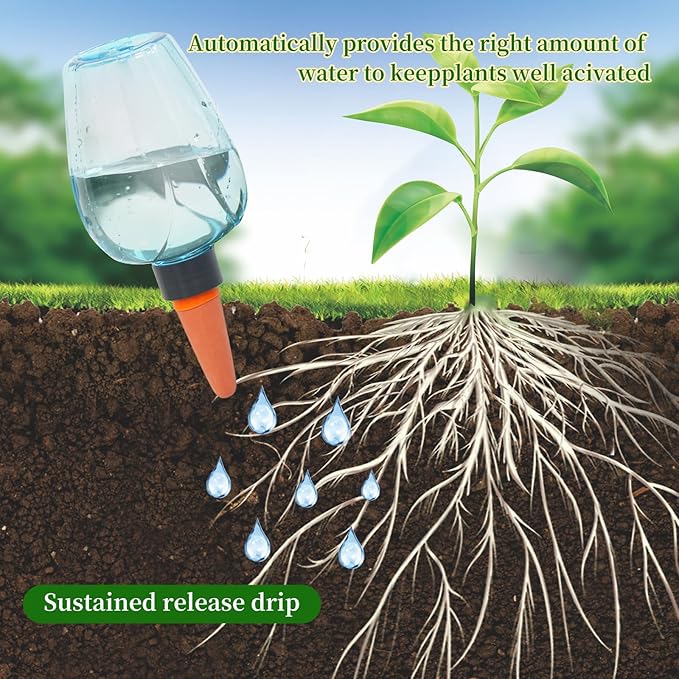 【Easy to use】:The automatic plant irrigator is simple in design and efficient in use. Simply fill with water, insert the globe's watering stake into your potting mix and fill with water, and the porous cone will slowly distribute water throughout the day, ensuring a steady and continuous supply of water for your plants.
