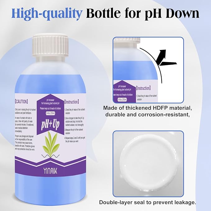 {Suitable for All Hydroponic Systems} YINMIK pH adjuster is suitable for all hydroponic systems (deep hydroponics, Aeroponics, nutrient film cultivation, drip irrigation, Aeroponic systems, irrigation systems, and liquid fertilization systems), as well as all other cultivation substrates, including various soils, water, coconut coir, etc.