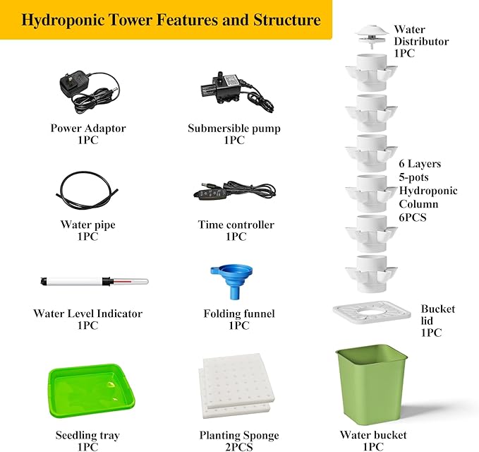 【Safe, Durable & Easy to Set Up】 Made of food-grade, BPA-free PP material,safe and durable. Setup is simple with all essential components included: planting tower, pump, timer, seedling tray, planting sponges, folding funnel and water level indicator. A water-level indicator enables easy monitoring. A folding funnel lets you refill nutrient solution without removing the bucket lid.