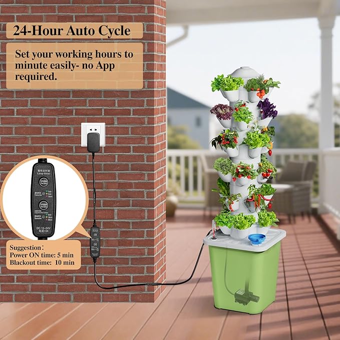 【Water Circulation System】 Our hydroponics growing system is designed with a water circulation system that helps circulate water, increase oxygen levels, and continuously deliver nutrients to the roots, allowing plants to grow much faster than in soil. Using a loop timer, no need to download an APP, power ON time: 5 Minutes, blackout time:10 minutes, saving energy. The hydroponic tower has a 10L bucket that lasts 1-2 weeks after full filling.