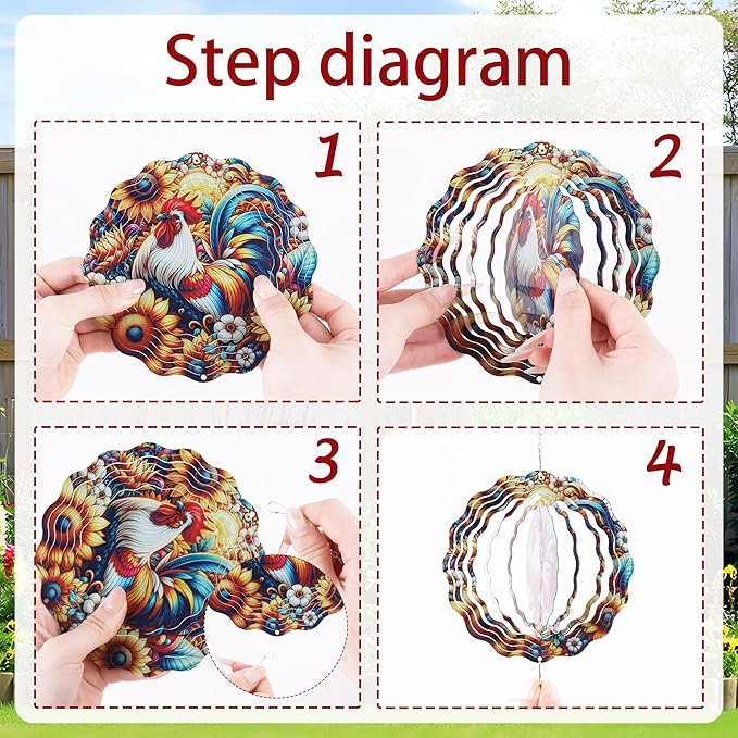Vibrant Rooster Design: Featuring a colorful rooster design surrounded by flowers, this wind spinner brings energy and charm to your garden, patio, or yard. The detailed rooster spins gracefully in the wind, creating a dynamic visual effect that makes it an ideal focal point for any outdoor space