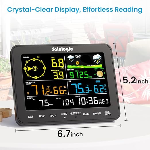 ๐ฒ.๐ฑ-๐๐ป๐ฐ๐ต ๐๐ผ๐น๐ผ๐ฟ ๐๐ถ๐๐ฝ๐น๐ฎ๐ ๐๐ถ๐๐ต ๐๐ฑ๐ท๐๐๐๐ฎ๐ฏ๐น๐ฒ ๐๐ฎ๐ฐ๐ธ๐น๐ถ๐ด๐ต๐๏ผThe weather station features a 6.5-inch HD color LCD screen with high-contrast visuals and oversized fonts for excellent readability. The adjustable backlight ensures clear viewing in any lighting condition, from bright daylight to low-light evenings. Whether placed in the living room, balcony, or garden, it provides a comfortable viewing experience, especially ideal for seniors or family members who need to check weather conditions frequently