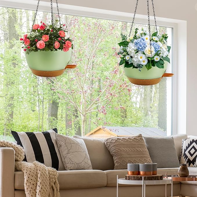 12 inch Hanging Planters for Indoor Plants, 2 Pack Self-Watering Hanging Planter Pots with Chain and Drainage Holes, Outdoor Plastic Hanging Baskets for Garden Home Decor