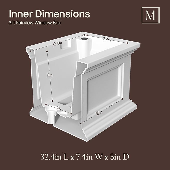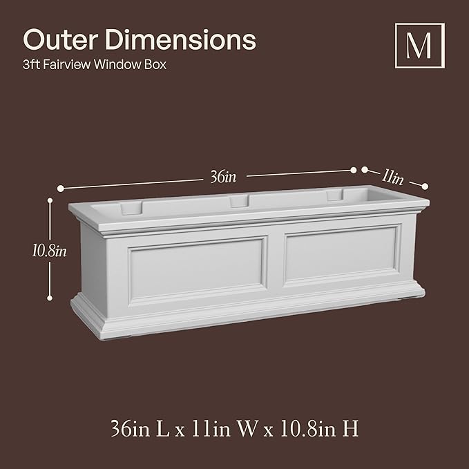 This Fairview window box planter comes with steel wall mount brackets for straightforward installation. Its design seamlessly integrates into windows, providing beautiful and hassle-free window sill decor for any home.