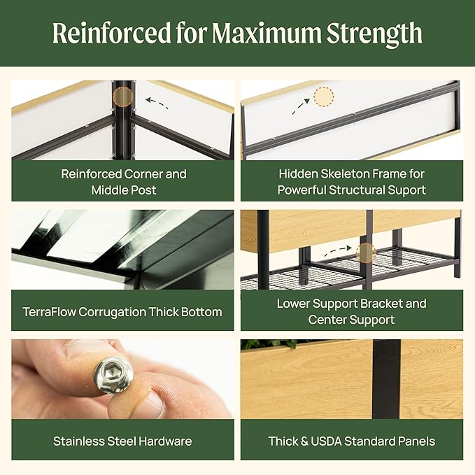 🌱Deep 15" Planting Box for Healthy Roots: This spacious garden bed provides ample soil depth for vegetables, herbs, flowers, and root crops. Strong internal support prevents bowing and keeps the bed stable when filled with soil.