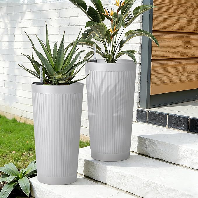 Water Level Monitor: Each tall planter includes a built-in water level monitor, allowing you to check remaining water at a glance. No more guessing or accidentally overwatering—simply refill through the watering port to keep your flower pots healthy and thriving, whether indoors or outdoors.