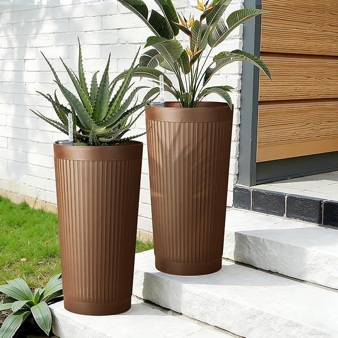 Set of 2 Tall Self-Watering Planters, 24" Large Planters with Water Level Indicator for Indoor & Outdoor Plants, Modern Planters for Garden, Patio, Balcony, Porch, Terracotta