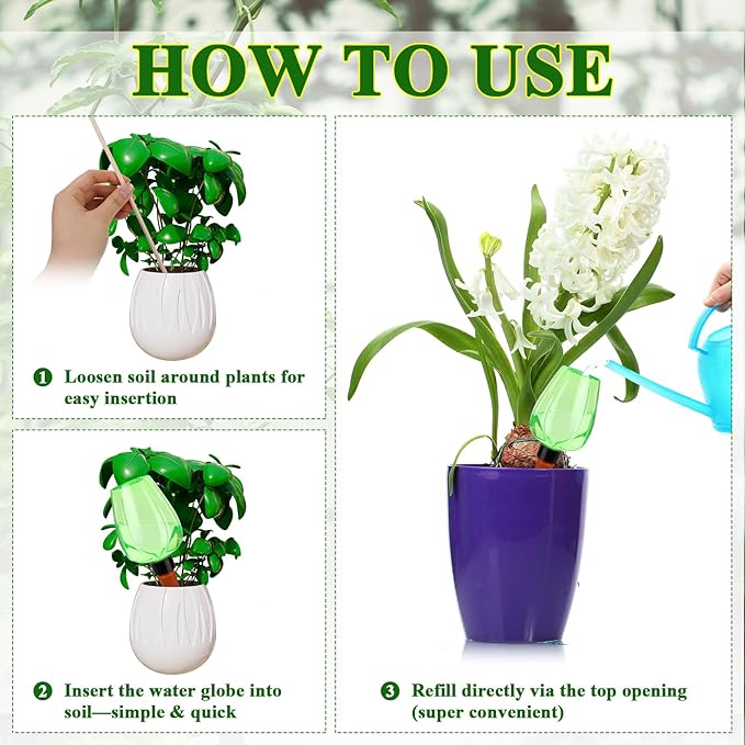 Slow Release Watering: The self watering globes feature the premium ceramic cone tip provides steady, controlled water release, fitting seamlessly into any potting soil. This precise delivery system helps prevent overwatering and root rot, ensuring optimal moisture levels for your plants