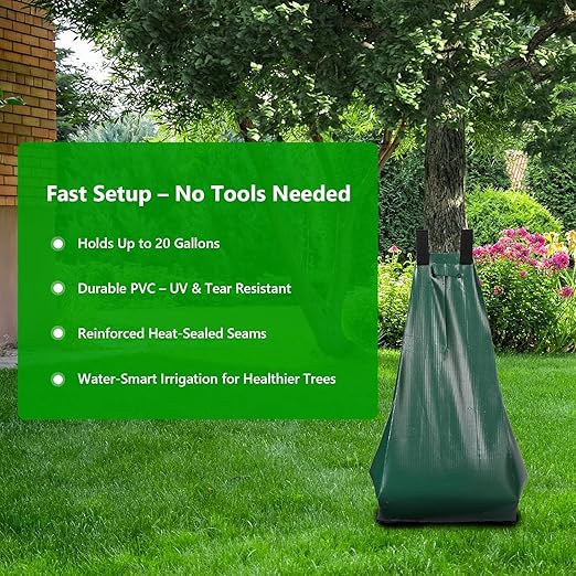 🔸 [Time-Saving 3-Pack – Cover More Ground]:Water up to three trees at once! This 3-pack set is ideal for residential yards, orchards, or landscaping projects. Easy-fill top opens wide and holds up to 20 gallons of water per bag